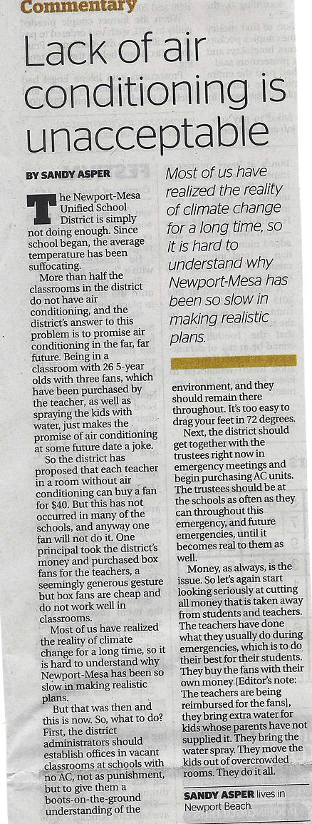 In addition, I have my own unanswered questions. Why does NMUSD throw money around when class sizes are huge (a Language Arts teacher friend of mine has classes averaging 37 a day, and at one point had 43 in a class). So, sit back in your comfortable chair, close your eyes, and ponder talking, listening, correcting papers and tests for 180 students, and trying to teach 180 students a day in classrooms that are too small, lacking materials, and with no air conditioning.